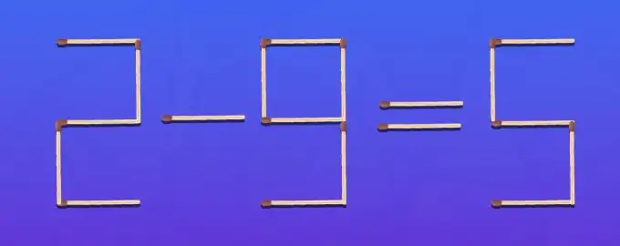Denne tændstiksudfordring udfordrer din opfattelse af tal og symboler. Den falske ligning 2 – 9 = 5 kan rettes med kun ét tændstiktræk, hvis du tænker på, hvordan.
