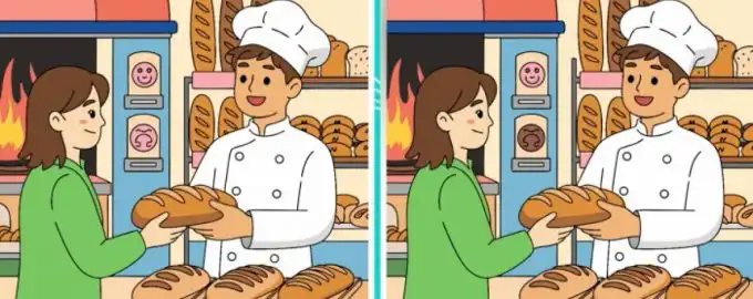 Foran dig er to næsten identiske illustrationer af en bager i sit bageri. Din udfordring er at finde de tre små, men afgørende forskelle mellem dem på kun.