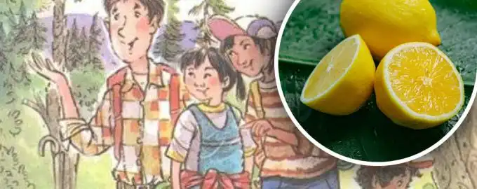 En citron er perfekt camoufleret blandt træer og grene i en skovscene med fem vandrere. For at finde den skal du ignorere de åbenlyse former og i stedet...