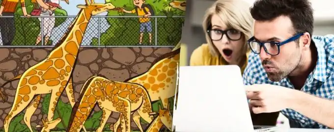 I dette farverige zoo-billede er en ananas og en sommerfugl dygtigt skjult mellem giraffer og tilskuere. Nøglen til at finde dem er at søge efter uregelmæssige konturer og.