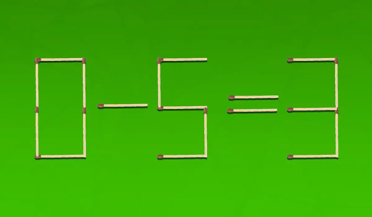 Dermed forbliver minustegnet intakt (da vi kun fjernede én lodret tændstik, og et minustegn kun har én lodret tændstik, så det forsvinder faktisk. I virkeligheden forsvinder minustegnet, og 0-tallet bliver til et 8? Nej, 0-tallet forbliver 0. Forvirringen opstår. Lad os se på billedet: På det løste billede er ligningen 8 – 5 = 3. Det betyder, at 0-tallet på venstre side er blevet til et 8. Dette opnås ved at flytte den øverste vandrette tændstik fra 0-tallet og placere den på bunden af det samme ciffer, hvilket omdanner 0 til 8. Herefter flyttes den lodrette tændstik fra minustegnet og placeres for at gøre tallet 3 på resultat-siden til et 9? Nej, på billedet er resultatet 3. Så den lodrette tændstik fra minustegnet må være blevet flyttet et andet sted hen eller slet ikke brugt. Dette viser, at der ofte er flere måder at fortolke og løse gåden på.