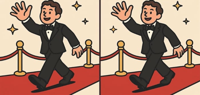 Denne visuelle gåde udfordrer din opmærksomhed og hurtige observationsevner. To billeder af en mand på en rød løber ser identiske ud, men tre små detaljer er ændret. Nøglen til at løse det er at scanne billederne systematisk og ikke lade sig narre af det overordnede, velkendte motiv.