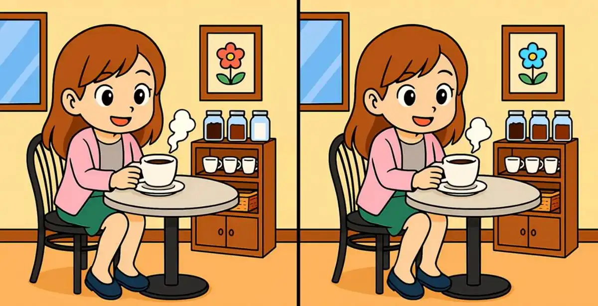 – Kig på én genstand eller område ad gangen på begge billeder: hendes hår, kop, øre, baggrundsgenstande.