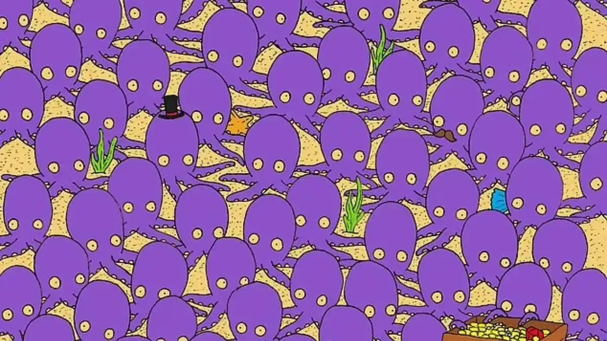 Dette puslespil tester din visuelle skarphed: blandt en flok blæksprutter er en enkelt fisk perfekt camoufleret. Nøglen til at finde den ligger i at søge efter en subtil afvigelse i formen og mønsteret, især i den nederste del af billedet.