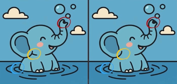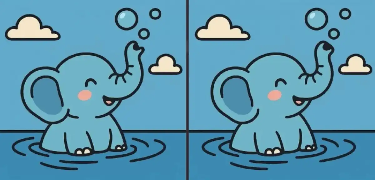 Foran dig er to næsten identiske billeder af en elefant, der leger i vand. Din udfordring er at finde de tre små forskelle mellem dem på kun 23 sekunder. Nøglen til succes er at skifte fokus mellem store områder og fine detaljer.