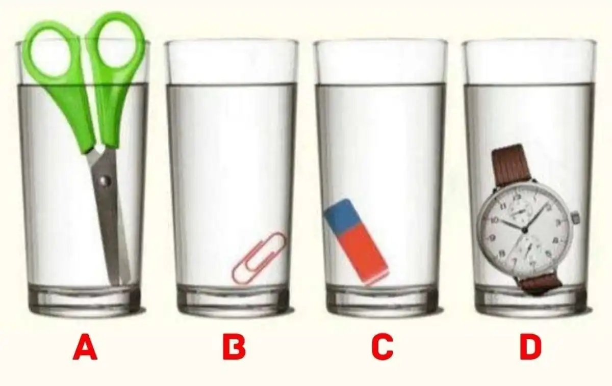 Fire glas fyldt med vand, hver med en forskellig genstand nedsænket: en saks, en papirclips, en elastik og et ur. Opgaven er at identificere, hvilket glas der indeholder den største mængde vand. Nøglen ligger ikke i størrelsen af glassene, men i den genstand, der er i dem.