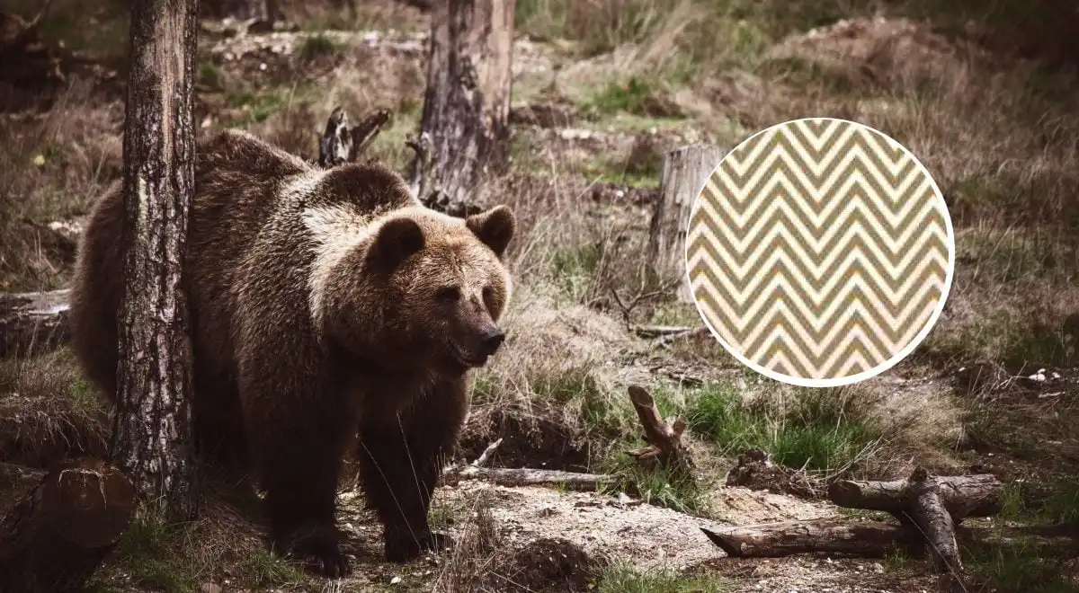 Nu til løsningen. Hvis du kigger til højre side af billedet, vil du se det. Dyret er en stor bjørn, der står oprejst. Dens ansigt og forkrop er dannet af mørkere skygger og linjer mellem træerne. Den venstre forpote (eller arm) er tydelig, når du først har set den, og dens øre sidder øverst. Når din hjerne først har sat sammen, at disse elementer ikke er tilfældige grene, men en organisk helhed, popper bjørnen ud og kan ikke ses fra.