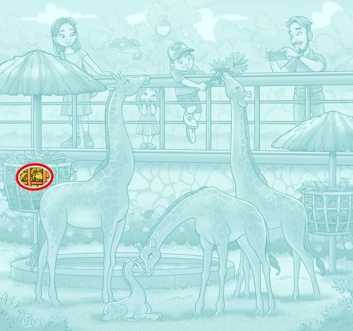 Forestil dig, at du er på en solrig dag i zoologisk have. Du står foran giraffernes indhegning, fascineret af deres elegante halse. En mand tager billeder, børnene peger, og en dreng fodrer en giraf med friske blade. Alt ser fredeligt og normalt ud. Men der er en ubuden gæst i scenen. Et andet dyr har sniget sig ind på billedet og blander sig med omgivelserne. Din udfordring er at finde aben – og du har kun 9 sekunder til det. Tiden starter nu!