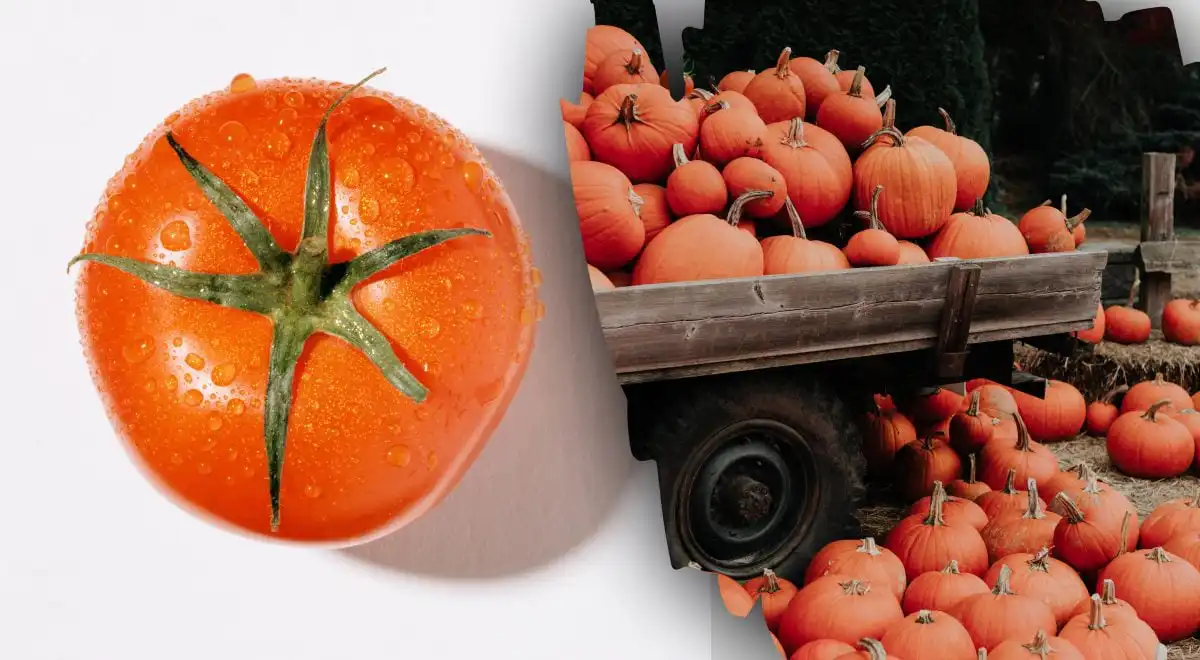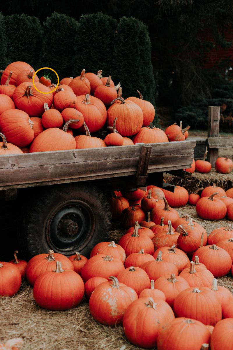 Nu til løsningen. For at finde tomaten skal du ignorere de spredte græskar på jorden og koncentrere dig om den store stabel på traileren. I den øverste række af denne stabel, tæt på midten, ligger der et græskar, der ser lidt anderledes ud. Det er ikke klumpet eller ujævnt som de andre – det er fuldkommen rundt. Og farven er ikke den dybe orange, men en klar rød. Dette er din forvildede tomat! Den har rullet op og blander sig, men dens røde nuance og runde kontur afslører den for det skarpe øje.