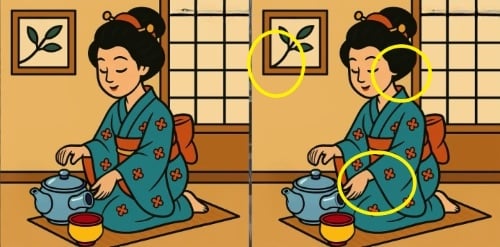 Dette klassiske “Find forskellene”-puslespil udfordrer din opmærksomhed og visuelle skarphed med to tilsyneladende identiske billeder af en kvinde, der drikker te. Nøglen til at finde alle tre afvigelser inden for tidsgrænsen ligger i en systematisk gennemgang af specifikke områder.