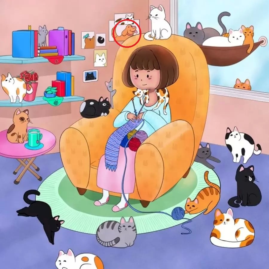 Forestil dig et hyggeligt stuehjørne. En pige sidder roligt på en stol, dybt koncentreret om sit strikkepind. Omkring hende myldrer det med nuttede kattekillinger i alle mulige positioner: nogen sover i kurve, andre jager garnnøgler eller leger med hinanden. Atmosfæren er ren katteparadis. Men ifølge opgaven er der også en hund i dette rum. Dit mål er at scanne billedet og lokalisere den på rekordtid – kun 15 sekunder. Det handler om opmærksomhed og evnen til at skelne detaljer, der ikke umiddelbart passer ind.