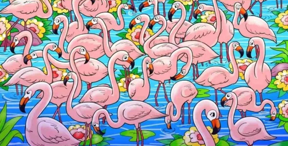 Dette er en klassisk visuel gåde, hvor dit mål er at finde en pige, der er perfekt camoufleret blandt en flok flamingoer. Nøglen til at løse den er at søge efter noget, der bryder det naturlige mønster – i dette tilfælde menneskelige træk frem for fugle.