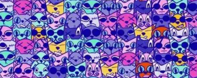 Dette visuelle puslespil udfordrer din opmærksomhed og evne til at skelne detaljer: blandt en flok gentagne katte er en enkelt hund snedig skjult.