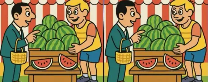 Dette er en klassisk “Find forskellene”-udfordring, hvor to næsten identiske billeder af en mand, der køber en vandmelon, skjuler tre små